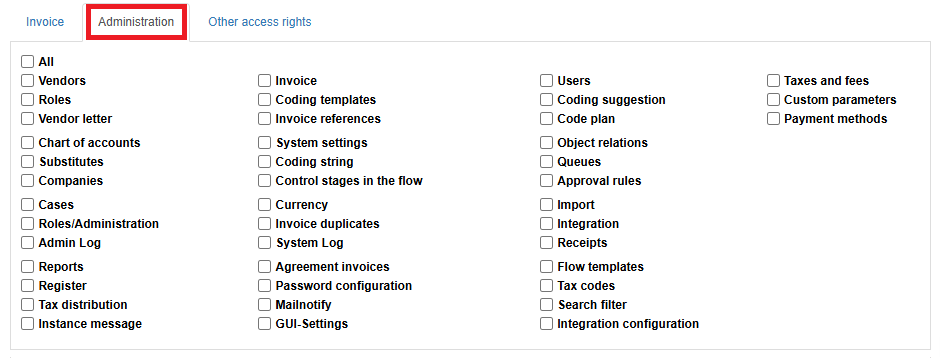 In the system, different administrator roles can be created which have access to different parts of the administration tool.