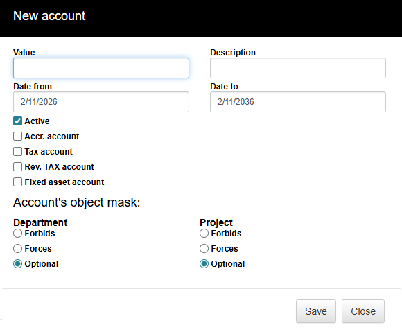 | Accr. account | If the account is an accrual account. Accounts marked as accrual accounts are displayed as an optional account in the drop-down list of the accrual form. |