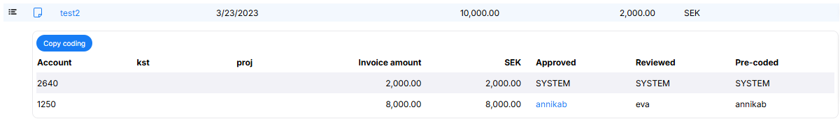 Press the Copy coding button and the coding rows from the previous invoice will be copied to the current invoice, the current invoice's invoice amount will be distributed as a percentage in the same way as the previous invoice.