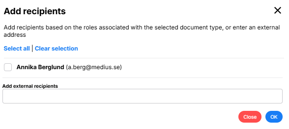 The recipients that can be selected are the users belonging to the roles associated with the document type in question.