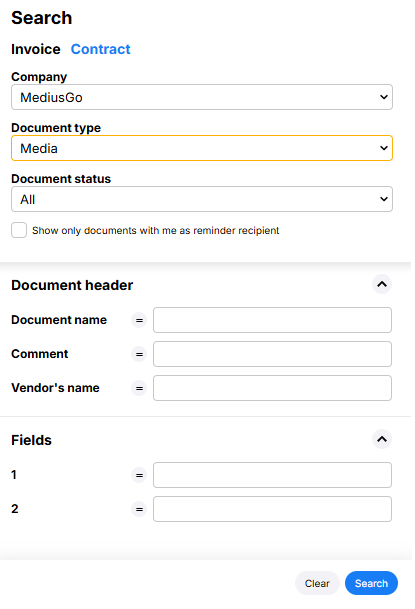 - Document type: Once the company is selected, the Document type drop-down list is activated. Select the document types you want to search. When Document type is selected, the fields under Document header are activated. If only one document type is selected, the fields specific to that type are also activated. If several document types are selected, the fields that are common to all these document types are activated.