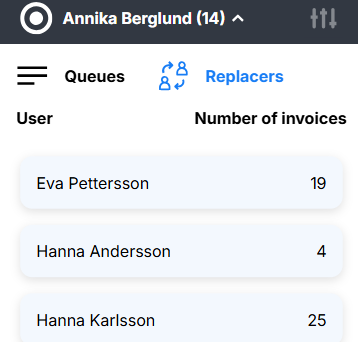 ReplacersIf you want to see the invoices of someone you are a replacer for, click on Replacers and a list will appear with the number of invoices of the users you are a replacer for. Click on a name to go to that user's personal queue. | ![]() |