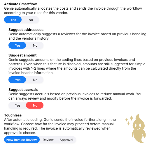 | Yes | Set this to Yes if you want to automate coding for this vendor. You decide how much you want to automate with the other settings. Read more about how Genie handles coding in the article Genie Smartflow - Coding. |