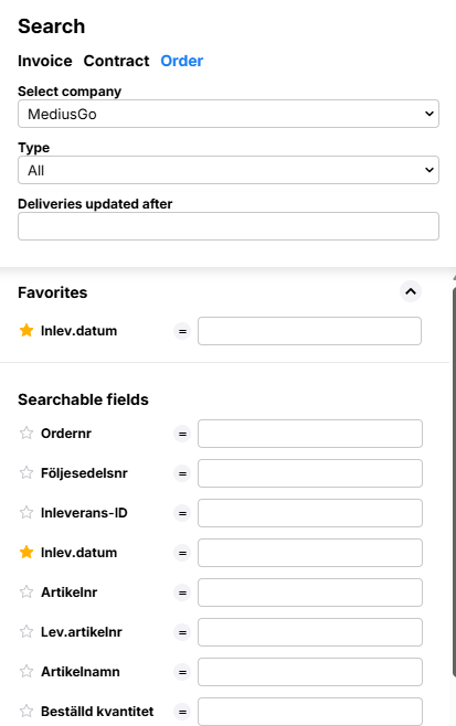 Searchable fields: Which search fields and columns are displayed depends on the purchasing system used and is determined in the administration tool (System Configuration-Import-Purchasing Integration-Item Line Order) during system setup. |