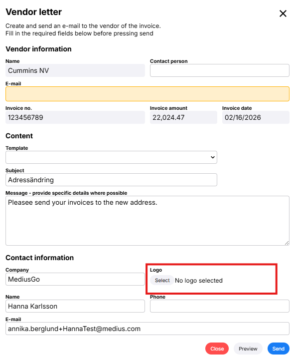 The selected logo will appear on the Vendor letter form