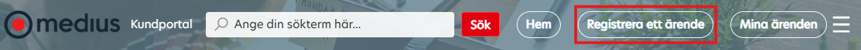 Om du är inne i administrationsverktyget finns ikonen i övre delen av den svarta kolumnen. Är du inte inloggad i MediusGo kan du skriva in webbadressen https://support-go.medius.com. - Klicka på Registrera ett ärende överst på denna sida.