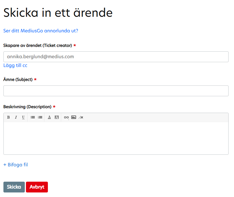 Har Du inga inloggningsuppgifter, klicka på Registrera dig för att skapa ett konto. - Sidan Skicka in ett ärende visas med din e-postadress angiven