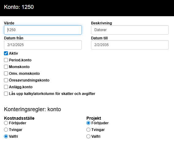 | Aktiv | Om kontot går att kontera på. |