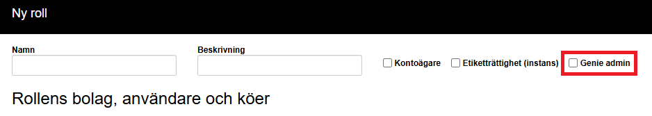- Organisation - Roller. Öppna den/de roller som ska kunna administrera och bocka i rutan Genie admin överst på formuläret. Rättigheten gäller i samtliga bolag rollen tillhör.