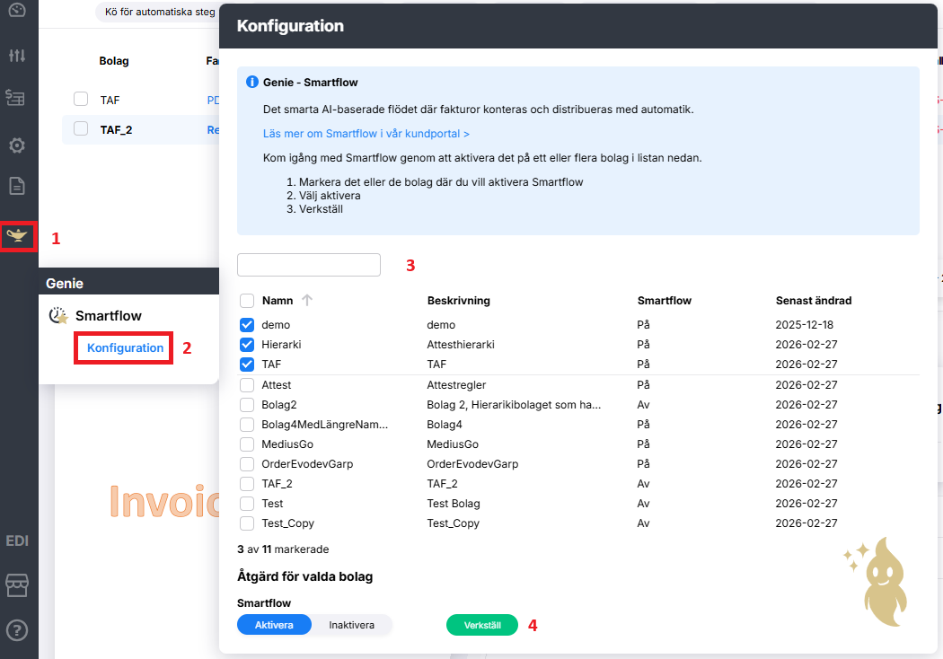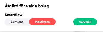 Om ni av någon anledning vill inaktivera Smartflow på något bolag gör ni på samma sätt som ovan med den skillnaden att ni markerar de bolag ni vill inaktivera och markerar Inaktivera innan ni klickar Verkställ.